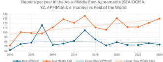 针对亚太-中东地区海缆维修情况展开详细剖析后,能够清晰地发现以下显著特点:在维修次数方面,亚太-中东地区远超全球其他所有地区维修次数的总和,并且从过往数据及发展趋势来看,该地区的海缆维修次数依旧呈现出持续上升的态势。