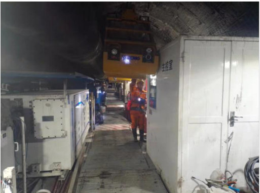 应用背景:高源煤业采用中铁工程装备集团有限公司生产的 EQC5830 型全断面掘进盾构机.(简称 TBM 型盾构机) 在矿井建设时期,由于 TBM 掘进速度较快,支护所需锚杆、锚索、喷浆料等运输成为制约快速掘进的主要矛盾。施工巷道成圆形,传统的轨道运输比较困难,宏源集团高源煤业经多方探索决定在 TBM 后配套皮带机上方安装单轨吊实现材料辅助运输,满足掘进需要。