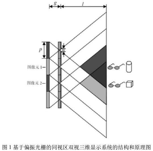 微图像阵列由来自3D场景1的图像元1和来自3D场景2图像元2交替排列组成。图像元的节距与狭缝光栅以及偏振光栅的节距相同。图像元1发出的光经过对应的偏振条1变成水平偏振光,然后被对应的狭缝调制,在观看视区内重建出3D图像1。图像元2发出的光经过对应的偏振条2变成垂直偏振光,然后被对应的狭缝调制,在观看视区内重建出3D图像2。偏振眼镜1的偏振方向与偏振条2的偏振方向正交,而偏振眼镜2的偏振方向与偏振条1的偏振方向正交。因此,在观看视区内,佩戴偏振眼镜1的观众只能看到3D图像1,佩戴偏振眼镜2的观众只能看到3D图像2。即,本文提出的显示器在同一视区内同时提供两个不同的3D图像。图像元1的数目为m,图像元的节距为p,显示屏与狭缝光栅的间距为g,狭缝的孔径宽度为w,观看距离为l。视区的宽度D和观看视角θ分别为
