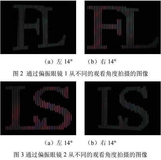 采用高分辨率打印机打印微图像阵列,搭建基于偏振光栅的显示实验装置验证所提理论。图像元1的数目是40,图像元的节距为3mm,显示屏与狭缝光栅的间距为3mm,狭缝的孔径宽度0.3mm。在观看距离390mm处,分别通过偏振眼镜1和偏振眼镜2从不同的观看角度拍摄3D图像,如图2和3所示。通过偏振眼镜1可以观看到“F”和“L”。通过偏振眼镜2可以观看到“L”和“S”。即,通过偏振眼镜1和偏振眼镜2可以分别观看到3D图像的移动视差。实验结果证明本文提出的显示器能够在同一视区内同时显示两个不同的3D图像。