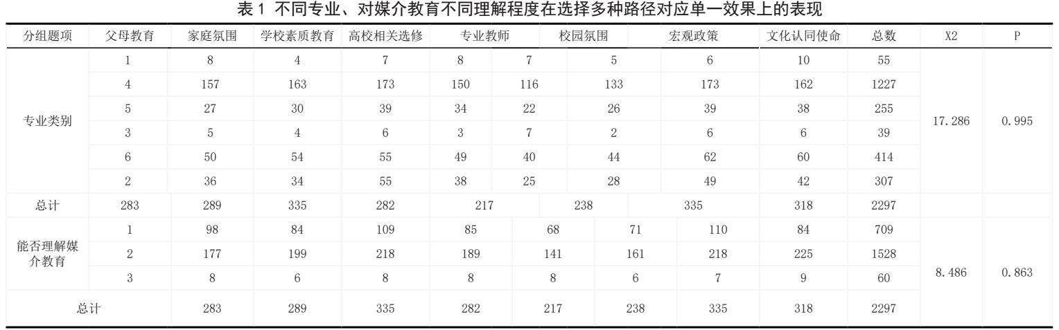 选取数个选择项对应学生吸取优秀文化并形成一定的文化判断力这个效果,多重响应频率分析表显示,分析项:父母教育、家庭氛围、学校素质教育、高校相关选修、专业教师、校园氛围、宏观政策、文化认同使命的选择比例比较呈现显著性差异,分布不均匀。证明对于同一效果来说,不同路径选择的认同不同。通过对此题中不同专业和对媒介素养教育理解程度不同的调查对象的数据分析,模型的多重响应分析交叉表显示卡方检验的显著性P值为0.995和0.863大于0.05,说明不同的主修专业和能否理解媒介教育在父母教育、家庭氛围、学校素质教育、高校相关选修、专业教师、校园氛围、宏观政策、文化认同使命的选择上不具有显著性差异。同时不同专业和对媒介教育的理解程度对假设的效果接收无影响,媒介素养教育具有普及性。