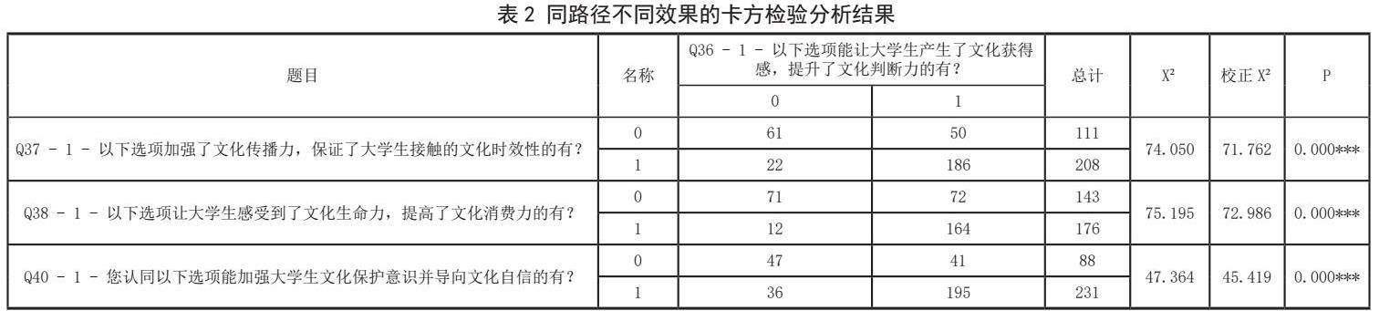 对同一路径家庭教育导向不同的效果而言,数据存在显著性差异(P值小于0.001)。将Q36、37、38的选项1关于同一路径的效果数据放在一起进行卡方检验,显示变量选择均具有差异,证明在同一路径下,效果也会产生差异。
