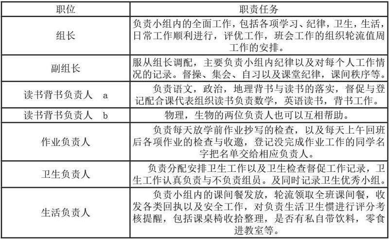 所以在接任新班级的前两周,笔者会根据原班委情况指定班长、学习委员、生活委员、体育委员等几个重要的工作负责人,然后着手收集每位学生的个人信息(包括爱好,特长、个人曾担任班干职务、个人崇拜的人与理由,以及前一个阶段的成绩等)。收集的目的是为了合理分小组,将全班根据不同人的性格,喜好,家庭成绩分成若干小组。宣布小组成员后,各小组先集中到一起商定组长、组名、组规、组目标以及组内个人分工。小组内的分工包括组长1名,读书背书负责人2名,作业负责人1名,卫生负责人1名,生活负责人1名。然后再进一步明确组内每个岗位的工作职责。如组长负责全面工作开展与质量监督,指挥提醒所有组员执行履行各自的职责。具体安排见下表: