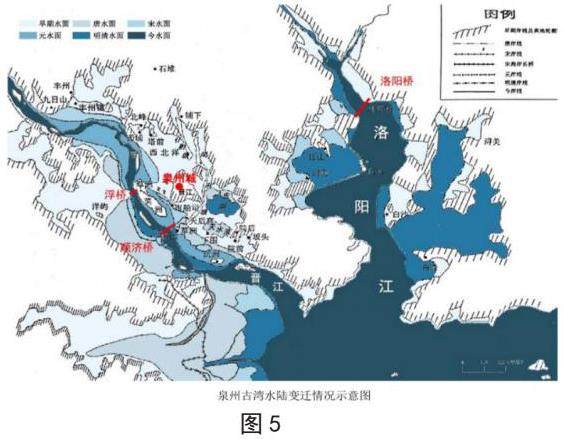 晋江沿岸的丰州是泉州地区第一个治所,从三国吴永安三年(260年)至唐开元六年(718年)持续了五百年左右,其间为区域政治经济中心,其管辖范围一度覆盖今天的厦漳泉莆四地,考古出土过许多六朝时期的墓葬,陪葬品反映出当地制瓷与手工业的成就。于 “开元六年析南安东南地置晋江县,泉州徙治焉。”图5示意泉州古湾水陆变迁情况示意图。
