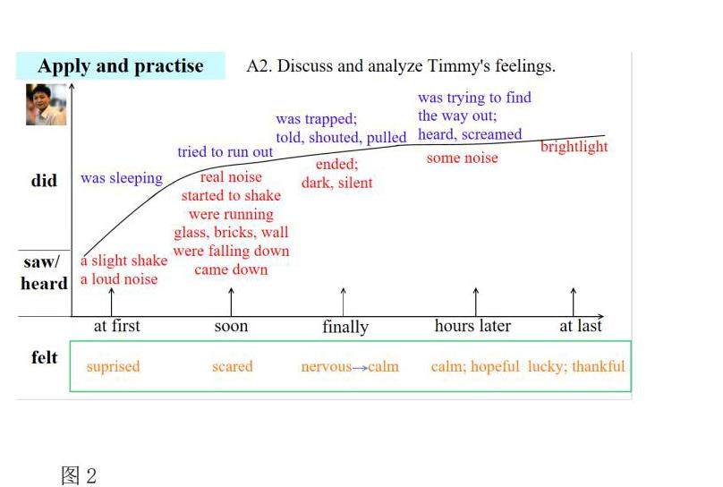通过解读故事的文体和结构,把握文本的大框架。The Taiwan earthquake是一篇记叙文,按时间先后顺序描述了地震的开始、地震过程、震后自救和最终获救五个部分。作者依照地震发生这一特定的线索展开故事的描述,通过描写主人公的动作、心理、语言描写来解读他的情感变化。