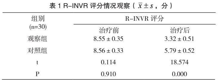 R-INVR 评分治疗前组间未见差值(P>0.05)。观察组R-INVR 评分显示治疗后降低更明显,组间差异存在(P<0.05)。见表1。