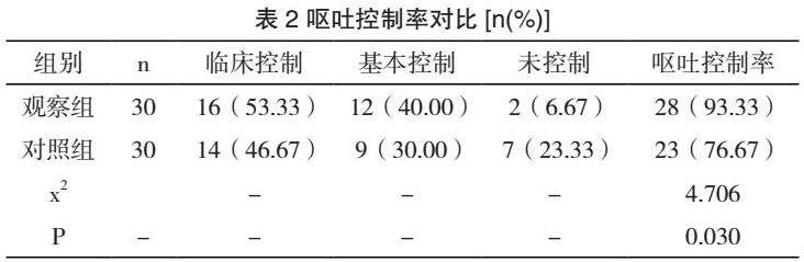 呕吐控制率观察显示观察组比值更高(93.33%、76.67%),差异存在(P<0.05),如表2。