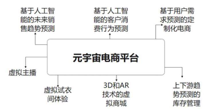 通过运用人工智能和虚拟现实,架构一个多元化的元宇宙电商平台。通过收集和分析大量数据的能力,人工智能可以使用机器学习功能来评估特定产品的未来销售趋势。此信息通常基于过去的消费者行为以及整体市场趋势,一旦确定了向上或向下趋势,将通知托运人和库存管理,以便根据需求生产适当数量的产品,实现基于人工智能的定制化电商。上下趋势导致更多数据驱动的库存管理模式,将再次节省业务时间和金钱,并生成更有效的业务结构,通过人工智能来辅助电子商务自动化可以成为其平台规则改变者,它可以节省大量的时间和精力用于关键任务。此外人工智能可以很快接管大量琐碎但耗时的任务,甚至可以创建一个AI虚拟助手来处理诸如回复电子邮件,安排会议和组织行程等工作。同时利用VR和AR结合的虚拟现实,架构元宇宙电商平台的整个场景平台,并引入虚拟试衣线上仿真线下的销售模式,引入国内已经比较成熟的3D模拟成品技术,在元宇宙电商商城内打造虚拟试衣间,结合消费者行为画像,实现精准人货场匹配。引入虚拟主播,应用虚拟现实和AIGC人工智能生成内容技术生成一个具有IP效应的虚拟主播,构筑虚拟主播空间,在元宇宙电商内实现真实与虚拟主播联播的良好局面,有效促进电商与元宇宙角色扮演双重体验,更符合Z时代一族。整个元宇宙电商平台的架构如下图所示。