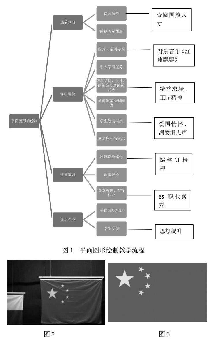 本课题平面图形的绘制以里约奥运国旗事件引入(如图2),引导学生思考颁奖仪式上中国国旗出错在哪,正确的国旗(如图3)为什么样,为什么一定要这样画,它背后的涵义又是什么。通过引导学生回答这一系列的问题,让学生“精准”观察到国旗四颗小星各有一个尖角要正对大星的中心,“真切”体会到小星环拱于大星之右侧的国旗设计,代表亿万人民心向伟大的中国共产党的寓意。进一步引导同学们继续思考,中国奥运代表团第一时间发现颁奖仪式上中国国旗错误,当场就此事向里约奥组委提出抗议。为什么中国代表团当场要提出抗议,要求里约奥组委立即纠正错误?为什么在奥运会如此重要的场合会出现国旗错误,这件事给予的启示是什么?引导同学们说出自觉维护国旗的正确性:是每个国民应有的素养;四星环拱而非平行,象征着在中国共产党领导下革命人民大团结,才使我们取得了新中国的胜利,更将实现中华民族的伟大复兴,这是我们的坚定信念;如果有精益求精的工匠精神,绘制国旗就不会出错!带着这样的感悟,带领学生使用CAD软件画小星和大星,实现环拱和涂色完成五星红旗的绘制。期间对用到的CAD关键命令进行了讲解,对学生绘制过程中出现的问题进行了巡回指导。
