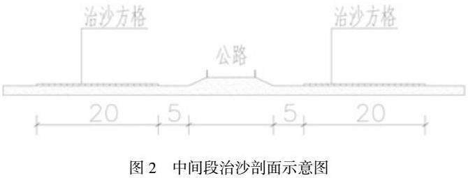 北侧30米建立沙障;公路路基外侧6米外建立20米宽治沙方格带,并在沙障和治沙方格带内侧修建移沙便道,以便将积沙及时清理运出(见图3)。