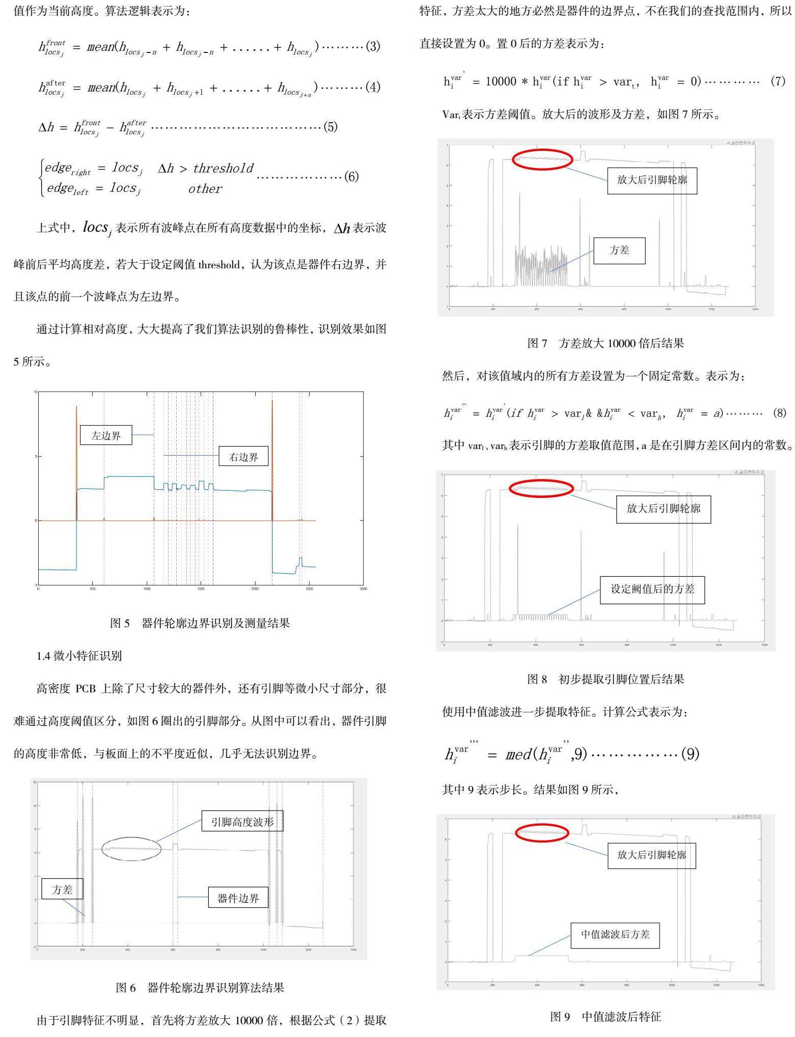 (2)对于对高密度PCB组件上尺寸较小的特征,在方差的特征提取算法及寻峰函数基础上,通过减小方差窗口、放大方差倍数、设定方差阙值、中值滤波计算方法,可以实现微小特征边界的精准识别;