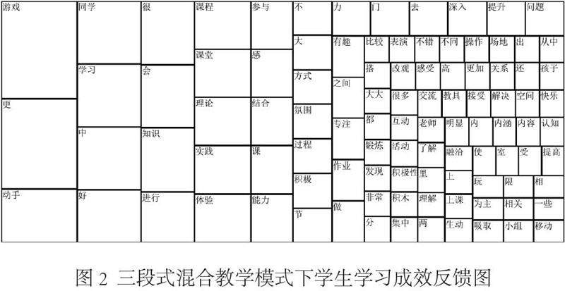 进一步追踪调研三段式混合教学实践成效时发现实施该教学模式后,学生自身对本课程的态度更为积极,参与感和成就感更强,借助Nvivo12对学生的学习反思进行词频统计发现,“更好”、“动手”“体验”、“积极”等词汇出现频率很高,由此反映出在三段式混合教学模式下,学生对于该课程投入的时间和精力明显提高。在访谈中还了解到学生自身有关学习的看法和方法都有了改变,懂得终身学习和批判性思考,掌握了基本的学习规划和学习策略,在任务和问题导向的情境下,学起来更有目标可循。在同伴学习、小组学习过程中也锻炼了自身的合作、讨论、设计和组织能力(见图2)。