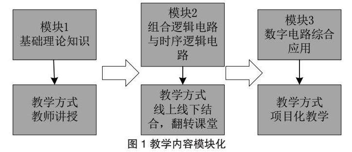 传统教学中教学内容是根据课程大纲设定,把学生看作一个认知水平相当的群体。而实际上学生之间存在很大的差异,一概而论的教学方式并不能满足处于不同水平的学生的学习需求。因此为了满足不同基础的学生的学习需求,将教学内容进行模块化处理,对于不同的模块应该采用不同的授课方式。可以将数字电路与逻辑设计的课程内容分为以下三个模块,如图1。针对不同的模块应该采用不同的教学方法,首先针对模块1理论知识设计较多,应该以教师讲授为主;针对模块2则可以采用翻转课堂的授课形式,首先为学生提供一些线上学习资源,课堂上的时间则由自由提问,老师进行答疑解惑,从而从可提高学生学习的积极性同时也可以提高课堂效率;针对模块3则可以采用项目化教学,以项目为基础出发,充分利用前期所学知识来完成项目,可以培养学生的工程思维和动手能力[3]。