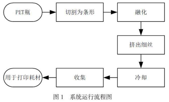 本系统的结构主要包括一个条形切割器、一个加热和冷却装置,以及送料和收集装置。其整体运行流程如图1所示,该过程利用了PET材料的循环使用特性,PET材料的熔点在250至255℃,在70°C时变软,冷却后固化。其中条形切割器将塑料瓶切割成宽度一致的塑料片,送料装置将塑料片送到加热台,加热铝块将其加热融化并通过喷嘴挤出细丝,同时冷却装置处的风扇辅助其降温固化。收集装置将固化后的PET细丝卷起成束。