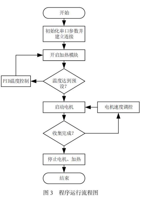 主程序的运行流程如图3所示:首先初始化串口获取温度传感器数据,然后根据使用PID算法[9]对温度进行调节,当温度达到预设温度后开启电机对融化的材料进行收集,直到所有材料都已经收集完毕,关闭电机和温度传感模块。