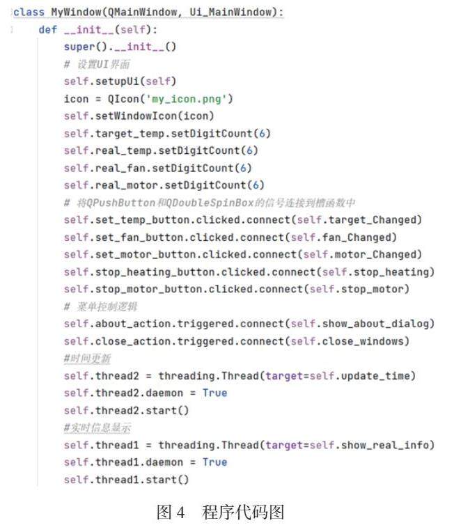 为了实现系统温度、电机速度、时间等信息的监控,使用PyQt开发出可视化界面。PyQt是一个基于Python的GUI(图形用户界面)工具包,用于开发交互式应用程序。它结合了Qt框架的强大功能和Python语言的简洁性,为开发者提供了创建丰富、功能强大的图形界面的便利,有利于构建用户友好的应用程序。图4为基于PyQt的程序界面的代码图。