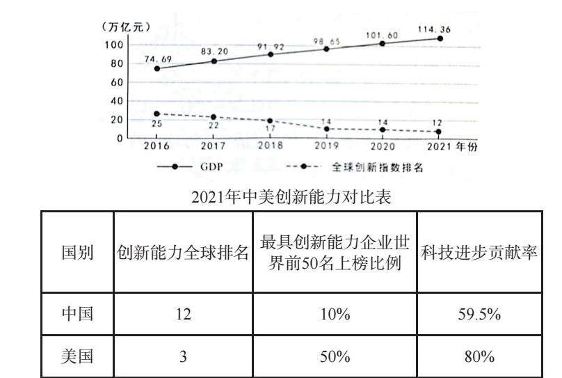 这类图表题是比较典型的题型,考查做这类题,首先要关注图的题目“2016-2021年中国国内生产总值和全球创新指数排名变化”,注记和图例;表的题目是“2021年中美创新能力对比”;然后分别观察图中GDP和全球创新指数排名的变化。表的变化需要从纵向和横向进行比较,同类合并同类项,不同类比较差距。