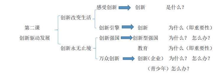通过审题,“根据材料二,运用“创新驱动发展战略”的相关知识,可知该题的答案由材料和“创新驱动发展战略”的相关知识组成。在解答此类题时,学生须认真掌握所学课本知识,构建完整的知识体系。[3]“创新驱动发展”是九年级上册道德与法治第二课标题,该课的知识框架体系见下图: