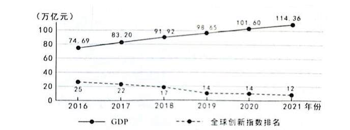 这幅图描述的是2016年-2021年中国国内生产总值(GDP)和全球创新指数排名的变化情况,黑色实线描述的是GDP的变化,黑色虚线描述的是全球创新指数排名的变化。如何变化呢?从图中可知,2016年-2021年GDP一直在增长,全球创新指数中排名不断上升。这只是图中所传达的信息,还需要联系书本知识,这种变化说明了什么。