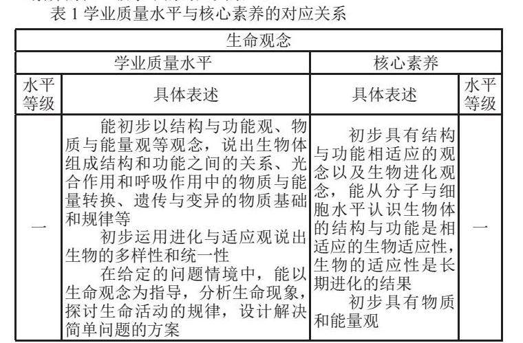 核心素养1-4水平具体划分细则体现了质量标准的基本要求[3],本文仅以生命观念为例说明核心素养水平等级和同一水平不同层次质量标准是一一对应的。表1展示了生命观念中学业质量水平与核心素养的在一级水平的对应关系[4]。