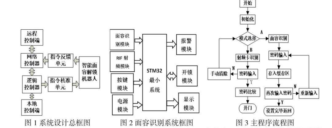 该系统以STM32F103为主体,采用了多功能微控制器。人脸识别系统则是对使用者进行身份认证和门锁的管理。使用者通过机器人视觉面容识别模块扫描,经认证后,便可进行解锁操作,并输出对应的信息[3]。面部识别的系统框图如图2所示。