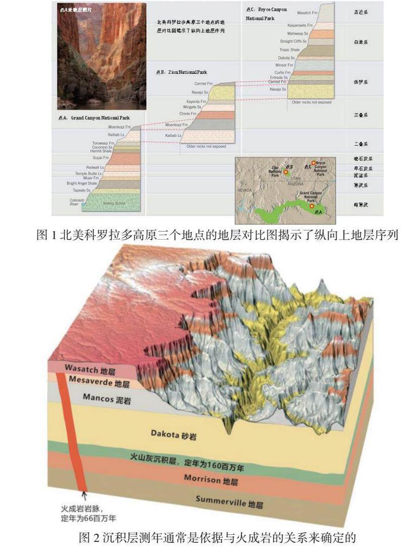 如图2所示,Mesaverde组岩脉和莫里森组(Morrison组)岩浆岩切割了Mancos页岩,其年龄可通过放射性测年法确定。岩浆岩之下沉积层显然形成于火山活动之前,而岩浆岩之上的沉积层形成时代较晚。该岩脉比Mancos页岩和Mesaverde组更年轻,但比Wasatch组更古老,因为该岩脉没有侵入最顶层。根据这些类证据,地质学家估计莫里森组地层形成于1.6亿年前,而顶部的瓦萨奇组(Wasatch组)的沉积是在6600万年前水流入侵之后开始的。这是成千上万个例子中的一个,说明了如何使用各种事件来判断相对年龄,也显示了实验室测年方法与岩石实地观测相结合的必要性。