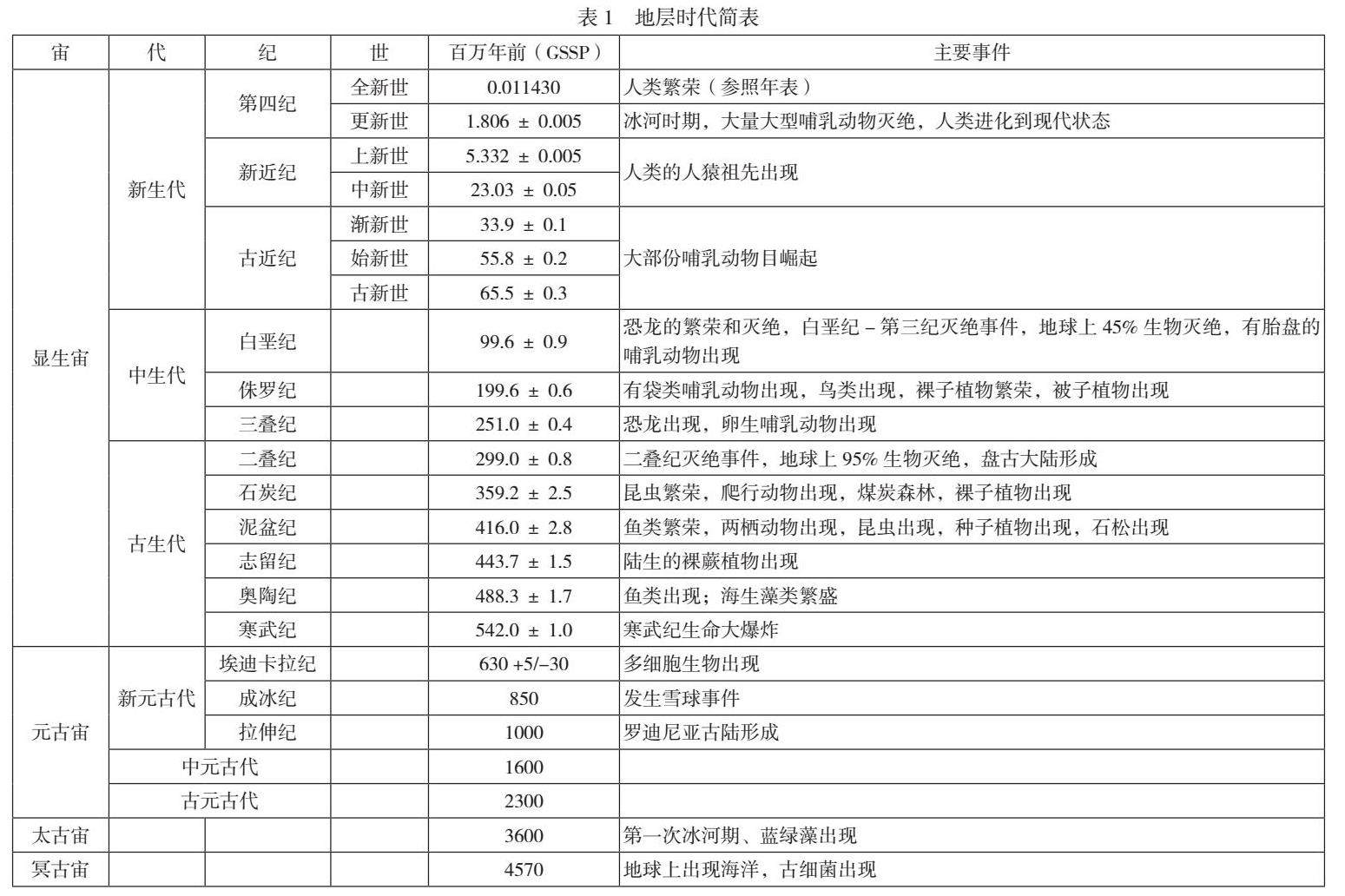地球46亿年的历史可以细分为许多不同的单位,这些时间单元与过去的地质事件一一对应,具有实际意义。如图3所示,地球上已知最古老的岩石的年龄大约是38亿年的冥古宙时期,冥古宙这个名字来源自希腊语Hades,意为“地下世界”,指的是地球早期历史上普遍存在的“地狱般的”环境。大约5.42亿年前开始的时代是显生宙(希腊语,意思是“可见的生命”)。显生宙的岩石和沉积物中含有大量的化石,记录了主要的进化趋势。显生宙由古生代(Paleozoe,ancient life)、中生代(Mesozoe,middle life)和新生代(Cenozoe,recent life)组成。顾名思义,这些时代是以世界范围内生物种类的剧烈变化为界限的。