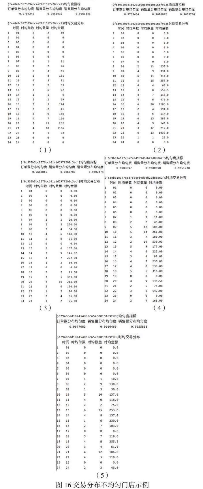 示例:最近一周的交易均匀度检验,自动检测出5家交易分布比较不均匀的门店,如图16所示。