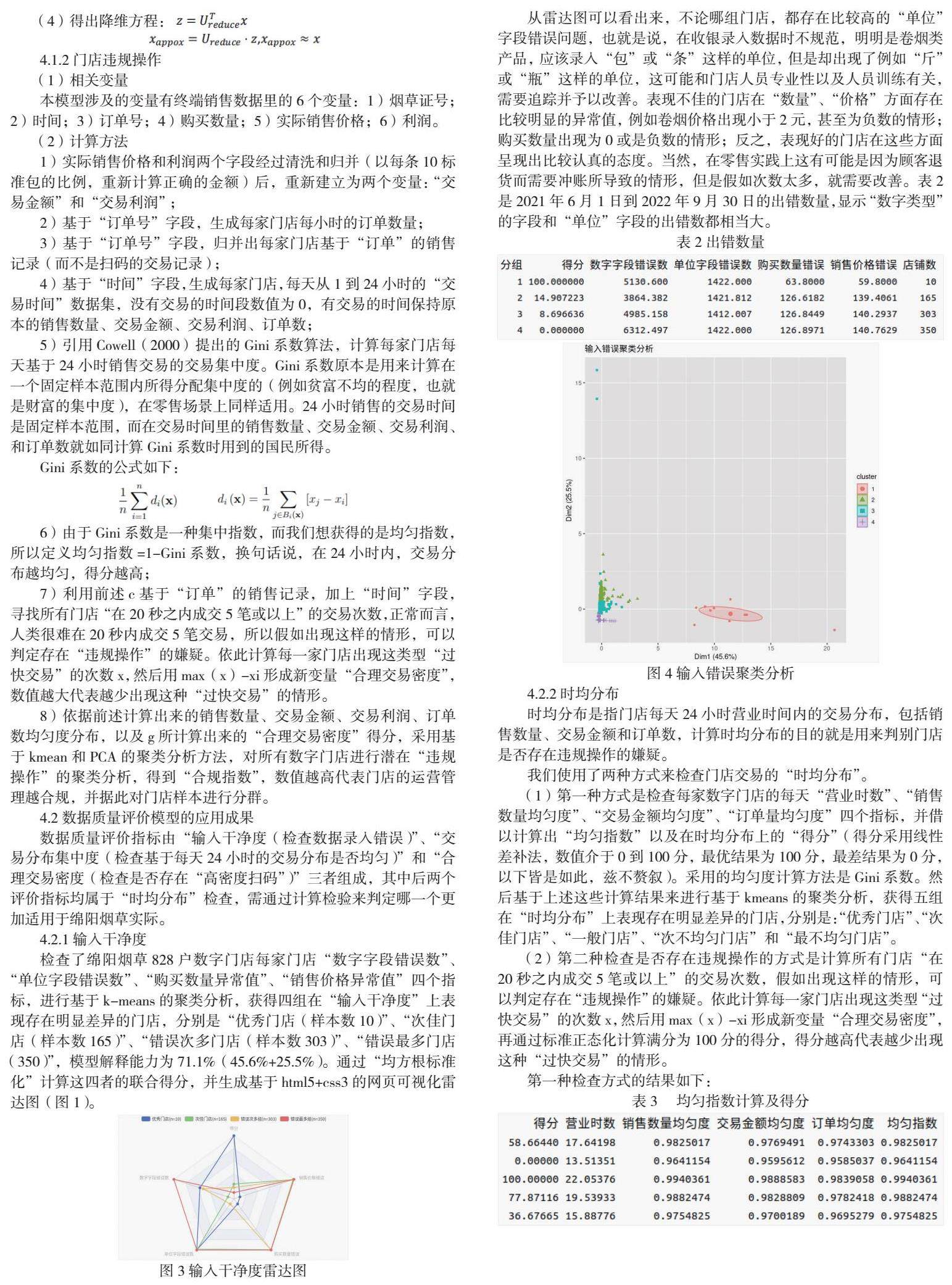 检查了绵阳烟草828户数字门店每家门店“数字字段错误数”、“单位字段错误数”、“购买数量异常值”、“销售价格异常值”四个指标,进行基于k-means的聚类分析,获得四组在“输入干净度”上表现存在明显差异的门店,分别是“优秀门店(样本数10)”、“次佳门店(样本数165)”、“错误次多门店(样本数303)”、“错误最多门店(350)”,模型解释能力为71.1%(45.6%+25.5%)。通过“均方根标准化”计算这四者的联合得分,并生成基于html5+css3的网页可视化雷达图(图1)。