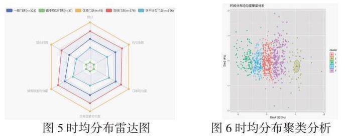(1)第一种方式是检查每家数字门店的每天“营业时数”、“销售数量均匀度”、“交易金额均匀度”、“订单量均匀度”四个指标,并借以计算出“均匀指数”以及在时均分布上的“得分”(得分采用线性差补法,数值介于0到100分,最优结果为100分,最差结果为0分,以下皆是如此,兹不赘叙)。采用的均匀度计算方法是Gini系数。然后基于上述这些计算结果来进行基于kmeans的聚类分析,获得五组在“时均分布”上表现存在明显差异的门店,分别是:“优秀门店”、“次佳门店”、“一般门店”、“次不均匀门店”和“最不均匀门店”。