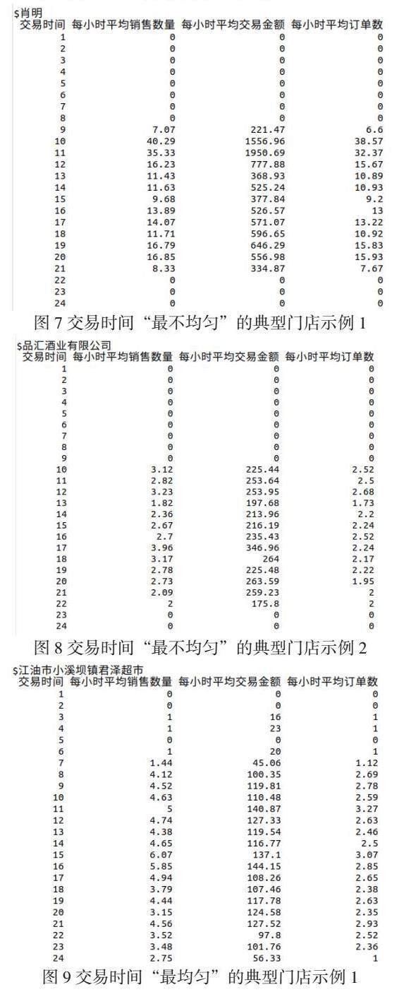 目的:观察一天24小时里交易分布最不均匀的门店,原始目的是寻找可能违规操作的门店(在一天里特定时间段违规集中扫码),虽然目前绵阳烟草数字门店基本上已经不出现这类违规情形了,还是可以作为监控交易均匀度的工具。