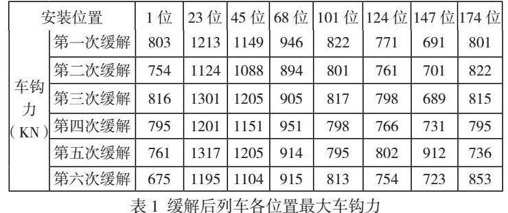列车在长大下坡道缓解后,由于中部机车向前后车辆供风,车辆缓解较快,而前部45位左右车辆缓解较慢,机车制动力无法满足列车在坡道上的下滑力,后部缓解车辆与前部未缓解车辆产生撞墙效应,与前部车辆挤压,从而形成最大压钩力。从上表可以看出,压钩力较大额的位置分别在第23位和45位。