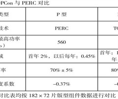 N型TOPCon组件与P型PERC组件相比具有四大优势,包括高效率、高双面率、低衰减、低功率温度系数。参数对比如下: