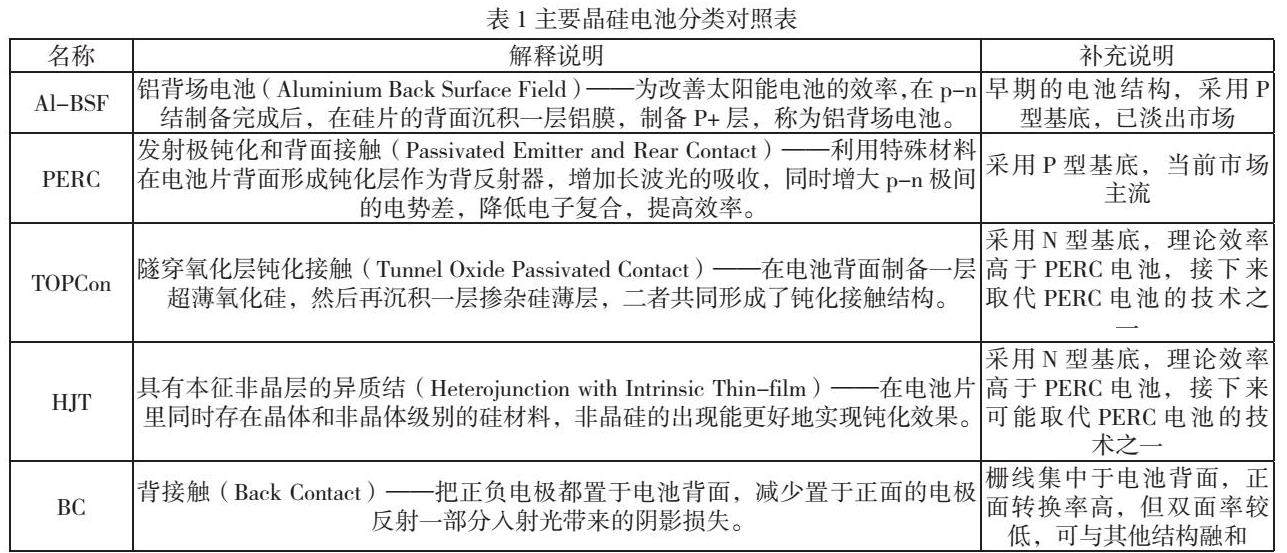除了表中罗列的几种主要类别外,在电池技术发展过程中还出现了PERL(钝化发射极背面定域扩散)电池、PERT(钝化发射极背面全扩散)电池、EWT(发射区环绕贯穿)电池、MWT(金属环绕贯穿)电池。目前还在研究的电池结构有将HJT技术与BC技术结合的HBC电池、将TOPCon技术与BC技术结合的TBC电池等。