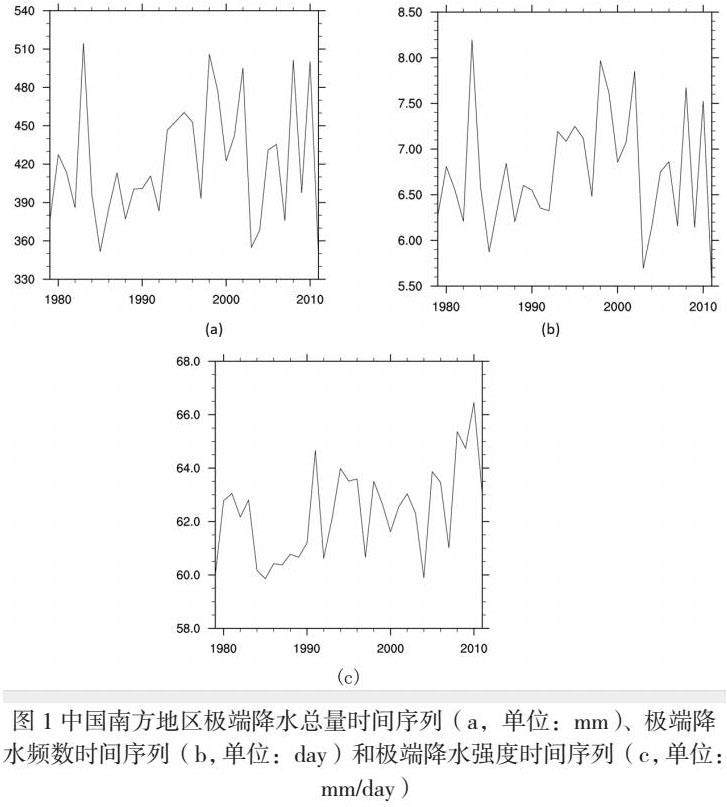 中国南方的极端降水总量和极端降水频数在1979~2011年间呈现出一种年际变化特征,而极端降水强度除此之外,从数值上可以看出近年来呈上升趋势。