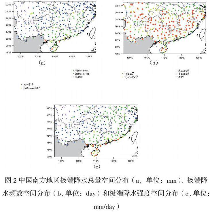 中国南方的大部分地区的极端降水总量处于289~465mm间,极端降水频数在7d及其以上,极端降水强度在40~86mm/d之间,三种指数的最高值均出现在海南及其附近。