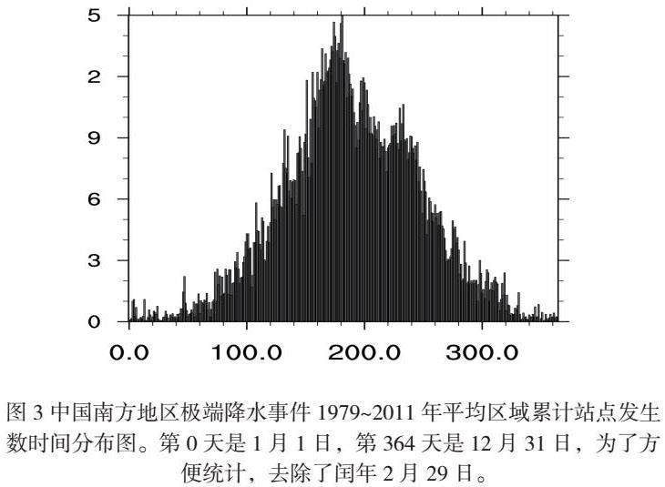 图3为中国南方地区极端降水事件1979~2011年共33年的平均区域累计站点发生数时间分布图。该分布图呈现出一个较好的正态分布,在夏季极端降水事件发生的站点较多,而在不常发生降水的冬季,极端降水事件发生极少,冬季极端降水的发生区域主要位于福建沿海地区。从图3中可以看出,在5月12日当天,平均区域累计站点发生数突增到了9.39,此后数值略有下降,但总体是递增的趋势,此后在6月23日到达次高值14.67,在6月30日到达最高值14.97,7月开始逐渐下降,在7月12日第一次突降到8.51,第二日累计站点发生数逐渐回升,在8月8日进行了第二次突降,数值为8.52,此后又进行了第二次回升,在8月18日上升到10.45,最终总体呈递减的趋势。
