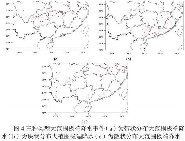 根据前期对极端降水指数的分析,本文选取了每日发生极端降水事件的站点数超过35个的事件和时间,定义为一次中国南方范围内大范围极端事件。在中国南方245个站点中,35个站点占了14.29%的区域,一方面保证了选取的范围足够大,另一方面也保证了样本量,故而选取35个站点作为定义的阈值。按照这个方法,在1979~2011年共33年内,一共筛选出30个大范围极端降水事件,它们都发生在5~10月,其中大部分集中在夏季(6~8月),另外有1个大范围极端降水事件出现在1983年10月4日,共有35个站点发生了极端降水事件,还有4个大范围极端降水事件发生在5月。在统计中发现,在30个大范围极端事件中,可按站点的分布方式将其分为3种类型(图4),一种是呈带状分布的(图4a),一种是呈块状分布的(图4b),还有一种是散状分布的(图4c)。顾名思义,带状分布的大范围极端降水事件是指站点分布跨多个地区且较为密集有序地分布成为一条带状;块状分布的大范围极端降水事件是发生极端降水事件的站点大部分密集地集中在一个区域;而散状分布是只发生极端降水事件的站点没有规律可循稀疏地地散落在各个区域。