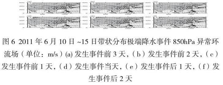图6为2011年6月13日发生的带状分布极端降水事件的850hPa异常环流分布。从图6中可以发现,此次极端事件的发生区域在副高北部急流交汇的锋区上。在极端降水事件发生的前3天(图6a),印度半岛南部在西南风的控制之下,在孟加拉湾区域转为西风,到达中南半岛,其北部的气流改变了方向转为西南风吹向云贵高原,而副热带高压处于30N°左右,在西伯利亚到朝鲜半岛的位置出现了一个气旋,此后,穿过云贵高原的气流在东行的过程中不断得到加强,与副热带高压边缘的西南气流汇合,北边的气旋也在持续发展,直到副高和和北边的气旋偏强偏西,在极端降水事件发生当天(图6d),锋区已经移动到了湖北——浙江一带,中南半岛的西南气流也持续为锋区提供充足的气流支持,北部的东北气流在南下过程中分成了两股急流,一部分气流转为西风汇入在日本南部太平洋海面的副热带高压边缘气流,另一部分则转为东风不断偏转与我国南部上空的锋区交汇,这些都为带状分布极端降水提供了强大的动力条件。之后,北部的急流稍稍北移,冷暖气流交汇较昨日变弱,在后期(图6f)继续加强,这就导致了在2011年6月17日又发生了一次带状分布极端降水事件。
