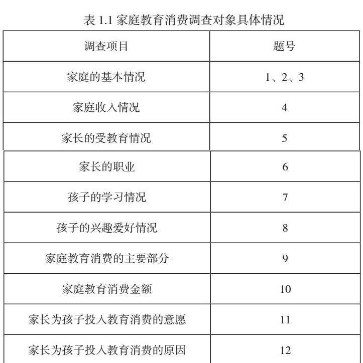 问卷从了解家庭的基本情况、家庭收入情况、家长的受教育情况、家长的职业、孩子的学习情况、孩子的兴趣爱好情况、家庭教育消费的主要部分、家庭教育消费金额、家长为孩子投入教育消费的意愿以及家长为孩子投入教育消费的原因各个方面展开。如下表1.1所示。
