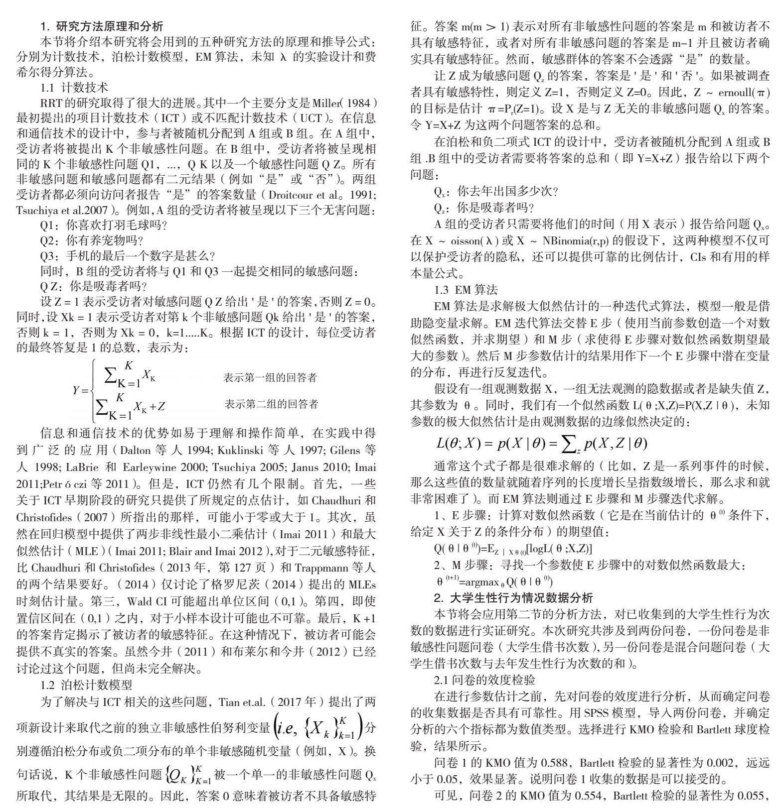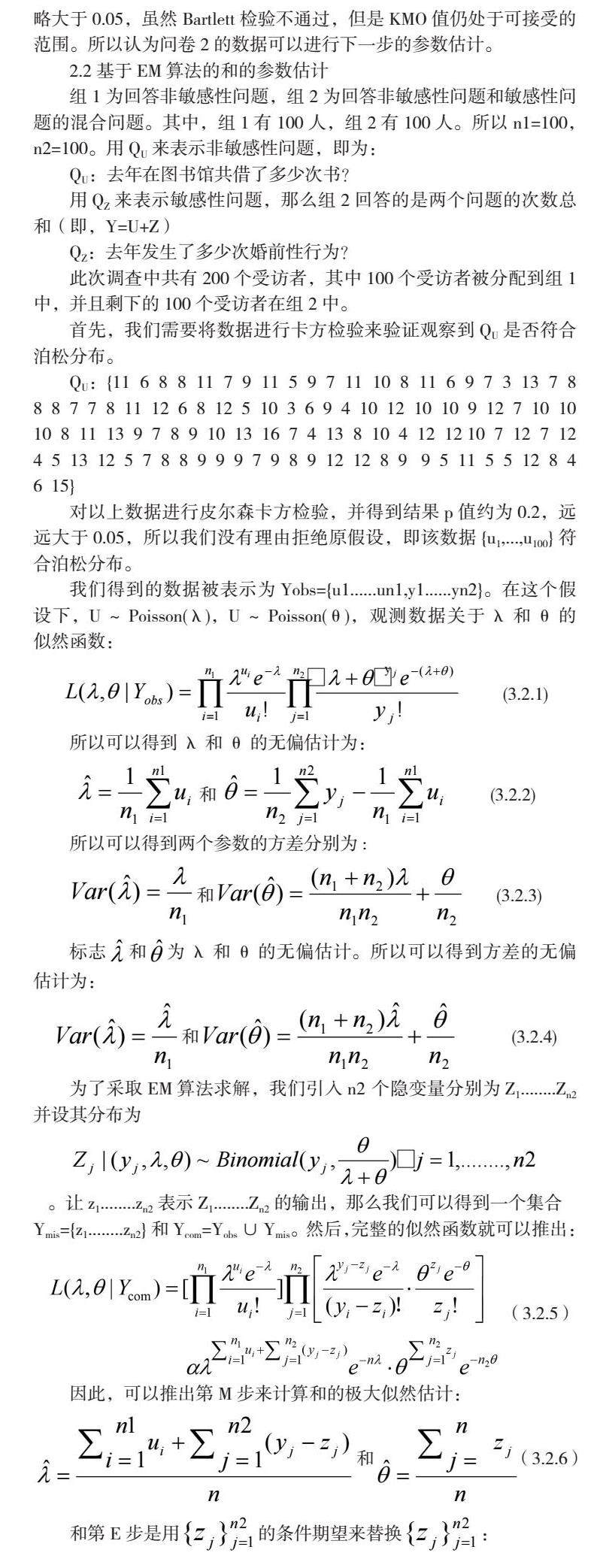 本节将会应用第二节的分析方法,对已收集到的大学生性行为次数的数据进行实证研究。本次研究共涉及到两份问卷,一份问卷是非敏感性问题问卷(大学生借书次数),另一份问卷是混合问题问卷(大学生借书次数与去年发生性行为次数的和)。