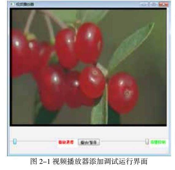 如图2-1所示,执行以上程序点击“播放/暂停”按钮,可以播放或暂停播放视频。拖拽horizontalSlider可以控制播放进度,拖拽horizontalSlider_2可以控制音量。
