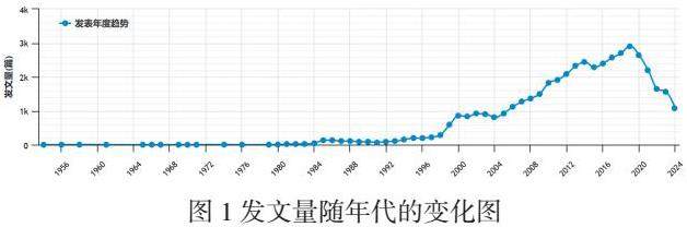 图1显示了我国创造力相关文献在中国学术网络出版总库(CNKI)发文量随年代变化的情由图可以看出,创造力的相关研究从1956年至2024 年的发展趋势大致可分为两个阶段:1956-2018 年为该领域的发文量处于波动上升阶段;2018—2024年为缓慢下降阶段。