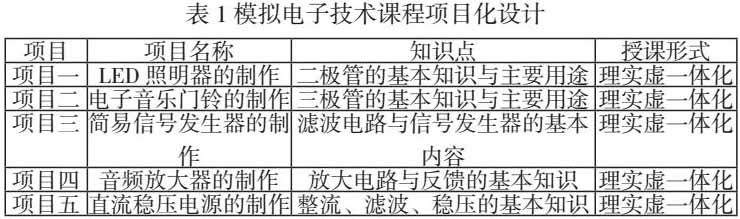 《模拟电子技术》这门课涉及的知识点比较多,按传统的一个个知识点讲解,学生兴趣不大且无成就感。为了提高学生的学习积极性,我们首先对课程内容进行了分析和梳理,整合成如下五个项目。