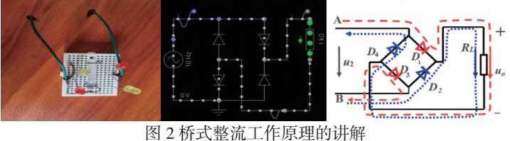 (2)知识点:桥式整流电路的工作原理。在理解桥式整流电路这个环节时,教师会设计让小组分工合作用四只发光二极管在面包板上搭建桥式整流电路。再用信号发生器产生一个1HZ的正弦交流信号接入到面包板上,通过实验观察到四只发光二极管是两两轮流导通的。引导学生再在电路模拟器上查看桥式整流电路的电子流动现象,推动学生分析这个现象背后的本质原因,得出桥式整流电路的工作原理。