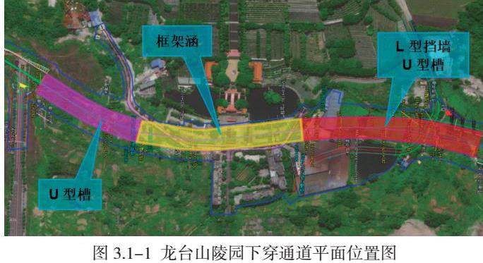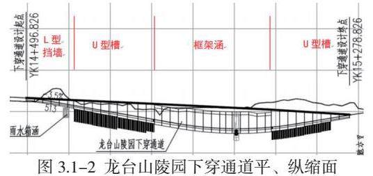 龙台山陵园下穿通道起始桩号ZK14+505~ZK15+287,总长782米。其中ZK14+815~ZK15+098段为框架涵,长283m,采用两孔矩形钢筋混凝土结构,结构单孔宽17.95m,净空尺寸17.75m×5m;ZK14+505~ZK14+620为钢筋混凝土L型挡墙结构,长115m;ZK14+620~ZK14+815、ZK15+098~ZK15+287为钢筋混凝土U型槽结构,长384m。龙台山陵园下穿通道平面位置如图3.1-1所示。