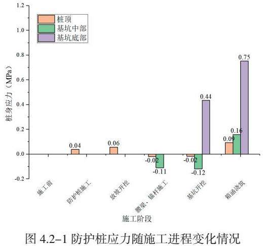 图4.2-1展示了防护桩应力随施工进程变化情况。