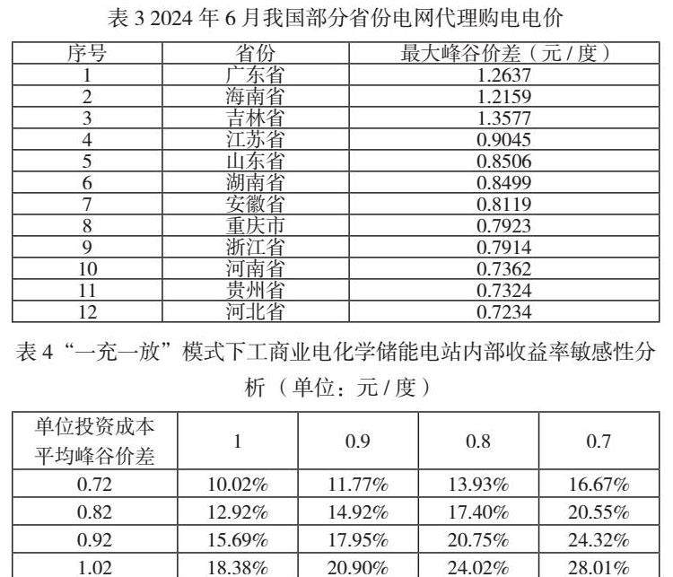 参照CNESA公布的我国部分省份2024年6月电网代理购电电价情况,广东、海南、吉林、江苏、山东、湖南、安徽等12个省市最大峰谷价差已超过了0.72元/度,已初步满足在“一充一放”模式下开展工商业储能电站开发的市场要求。对于“两充两放”模式,由于该模式需要满足有两个不同的峰谷或峰平时段,因此对分时电价政策要求相对苛刻,在目前分时电价政策趋向于每天仅有一个峰谷或峰平时段的情况下,本文认为通过“两充两放”进行峰谷套利的可行性较小,未来“一充一放”模式将是工商业储能电站进行峰谷套利的主流模式。
