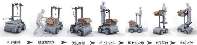 货物装载:工作人员启动轻触式开关,打开补货车围栏,并将货物箱放置在平台上。平台设计考虑了货物尺寸和重量,确保足够的面积和承重能力。
