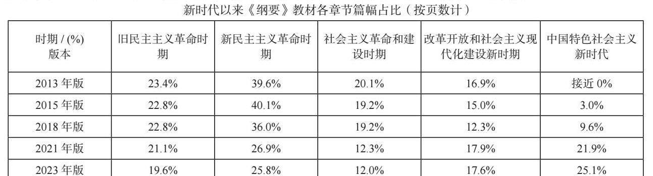 篇章设置变化的同时带来的是各个部分文字篇幅的变化。《纲要》教材中各个历史时期的文字篇幅一直在动态调整中。按页数统计,教材中旧民主主义革命时期的篇幅比重从2013年版的23.4%缓慢降至2023年版的19.6%。新民主主义革命时期的篇幅在2015年版之前始终占40%左右,2018年版进行了一定程度的删减,2021年版则进行了较大幅度的删减,到2023年版约占全书篇幅的25.8%。社会主义革命和建设时期的篇幅在2018年版之前维持在20%左右,2021年版则降到了12.3%,2023年版教材基本不变。改革开放和社会主义现代化建设新时期的篇幅由于与十八大之后的内容相分离,在2015年版和2018年版则进行了较大幅度的删减,2021年版教材重新增加了改革开放和社会主义现代化建设新时期的篇幅。根据编写组2021年版教材的《修订说明》所指出,其增幅约2.5万字,页数占比由原来的12.3%提高到17.9%。2023年版教材基本不变。中国特色社会主义新时代的内容从2015年版教材中开始成章节出现,其篇幅也随着新时代历史下限的延伸而不断扩充。其中2021年版教材中,新时代篇幅的字数由原来的2万多字增至近6万字,页数占比由原来的9.6%提高到21.9%。2023年版教材进一步页数比进一步提升为25.1%。中国特色社会主义新时代相关内容不断扩充,成为这5版教材修订的重点所在。